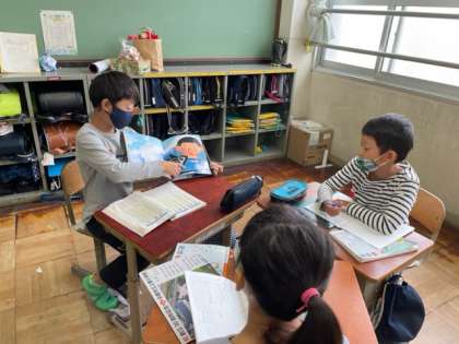 2年生に読み聞かせをするならどの本がいいかをテーマに話し合っています。