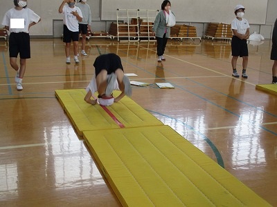 久しぶりにマット運動をしました。ペアの友だちが「足はそろっているけど、もっとスムーズに回るといいよ。」「足がまだあがっていない。」などのアドバイスを伝えていました。アドバイスを受けて、ねらい2では、ゴムの場で側転をし、ゴムを超えられるか試したり、頭はね跳び、首はね跳びの練習をしたりする人がたくさんいました。壁倒立ができる人も増えてきました。