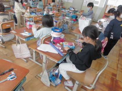 図画工作科では、箱や紙袋などを飾って、素敵な入れ物を作りました。