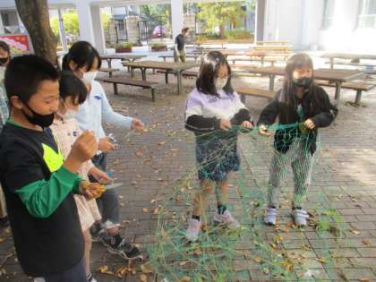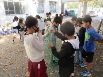 1学期から育てて観察をしてきたツルレイシの後片付けをしました。来年の4年生が気持ちよく使えるように、網に絡まったツルを手やハサミで丁寧に取り除きました。