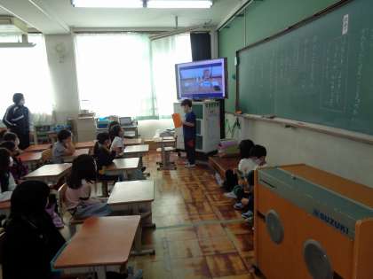 1年生から6年生まで各クラスに分かれて,生活で学習した「あそんでためしてくふうして」のおもちゃ作りの作文を読みました。