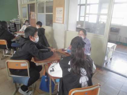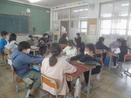 1年生との遊びの話し合いをしています。遊びのルールなどを班で話し合いました。とても熱心に話していました。1年生も6年生も楽しめる遊びにできると嬉しいです。