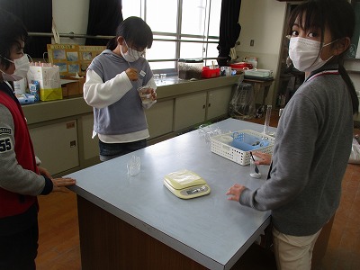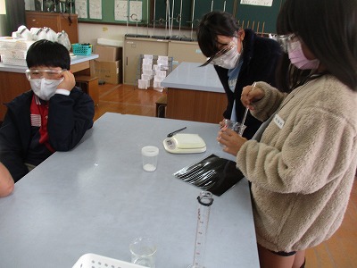 もののとけ方の学習で実験をしました。ミョウバンと食塩の水の溶け方について学習しました。よく溶けるように交代でガラス棒でくるくると溶かそうとしていました。