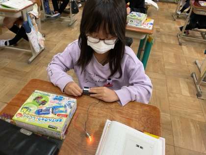 豆電球に明かりをつけるには、どのように導線とかん電池をつなげばよいかを予想してから実験しました,いろいろなつなぎ方を考えていて、予想したつなぎ方で明かりがつくかどうか、一生懸命調べていました。輪のようにつながった電気の通り道のことを「回路」ということも知りました。