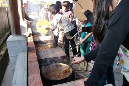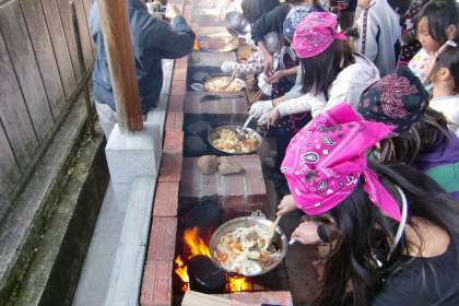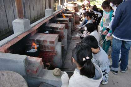 野外炊事場では,燃え上がる炎の中に,飯ごうを置き,ご飯を炊きはじめました。鍋には下ごしらえを終えた野菜を入れて炒め,「雲仙島原の自然水」を注ぎ,野菜に火が通ったのを確かめたらカレールーを入れ,ぐつぐつ煮たらおいしいカレーの出来上がりです。