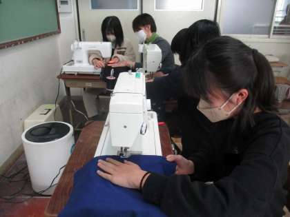 裏側をミシンでぬった後、ていねいにアイロンをかけて、表面もぬいました。布に合う糸を考えて、ぬおうとしている姿が見られました。完成すると、「給食に使いたい。」ととても喜んでいました。
