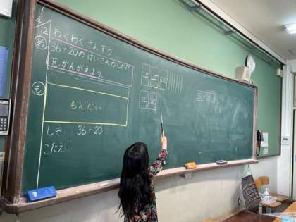 今日は10の束を使って計算を考えていきました。1年生で学習したことを思い出して頑張っていましたよ。