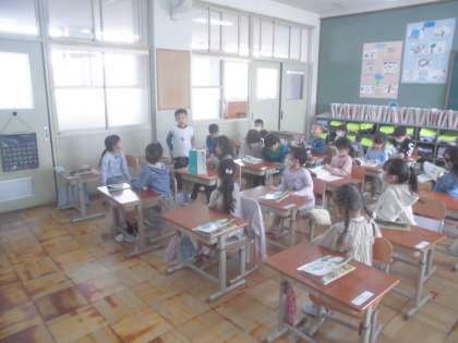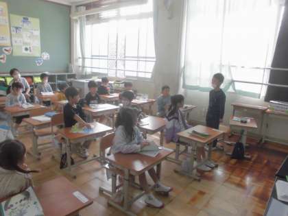 教科書の「いいてんき」を音読しました。教科書を見ることなく暗唱していました。子どもたちは、一番遠くの友だちに向かって音読をしていました。聞く人は、話す人の方におへそを向けてしっかりと聞いていました。学習に向かう姿が素敵でした。