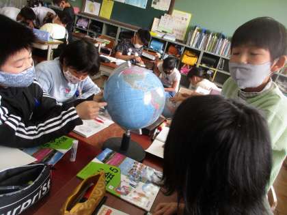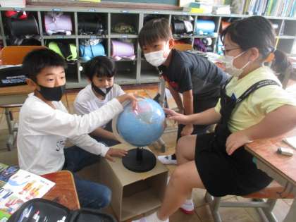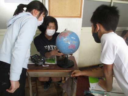 今日は、グループごとに地球儀を見ながら、気づいたことなどを話し合いました。