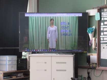 給食も始まり、給食当番も自分たちで行います。使ったエプロンを上手にたたむ方法を勉強しました。きれいにたためたかな?
