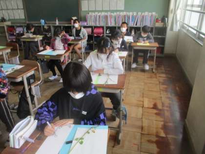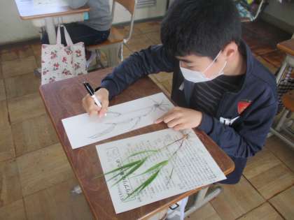 校庭から雑草を見つけて絵にかきました。そのかいた雑草になりきって雑草の気持ちを考えた詩も書きました。みんな雑草になりきって素晴らしい詩ができました。教室の後ろに貼ってありますので、参観の日に見てください。