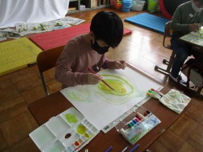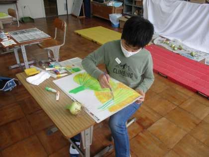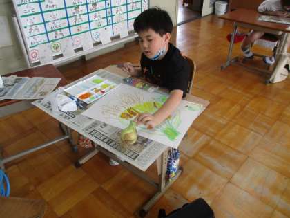 鉛筆やパスで描いた後は、絵の具を使って、工夫して色を塗りました。色の濃淡や重なりなども考えながら楽しく描く様子が見られました。「やったあ!できた。」と嬉しそうな子どもたちでした。