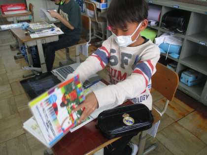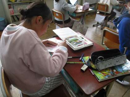図工の作品で使うため、自分の全身の自画像を描きました。ポーズをとって、ギガ端末で撮影してから描くなど、とても楽しそうでした。自分そっくりに描けている人もいました。どんな作品になるのか楽しみです。