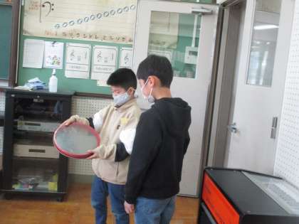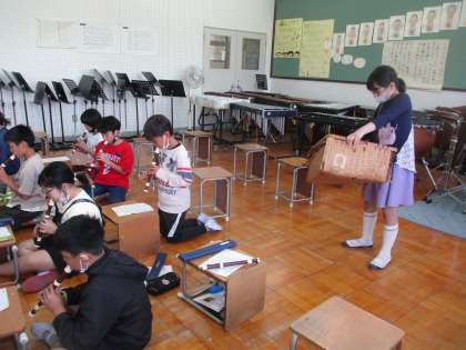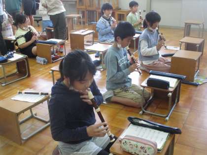 リコーダーの演奏に合わせて、オーシャンドラム、柳行李と小豆で波の音を出し手合わせていました。ゆっくりと動かすと本当に波の音に聞こえました。交代しながら演奏していました。
