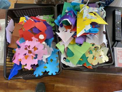 ちょきちょきかざりを作りました。四角に折ったり、三角に折ったりした折り紙をはさみを使って切りました。できたかざりが、お面になったり、ハートになったりしていました。できたかざりを楽しそうにしていました。