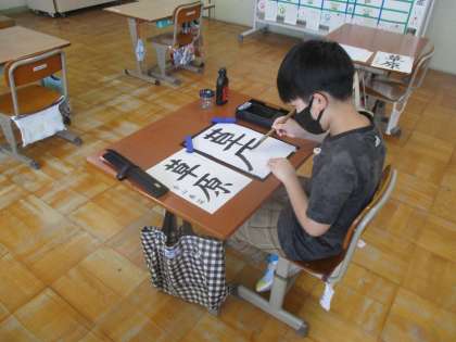 3組の5年生の習字では「草原」という字を書きました。お手本を見ながら丁寧に書いていました。うまく書けたので満足そうでした。