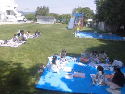 ゆうゆうバスに行って、外で読書をしました。1人3冊を目標に読みました。興味のある本を楽しそうに読んでいました。これからも様々な本に興味を持って読書を進めていきたいです。