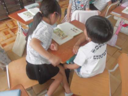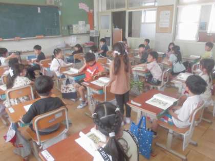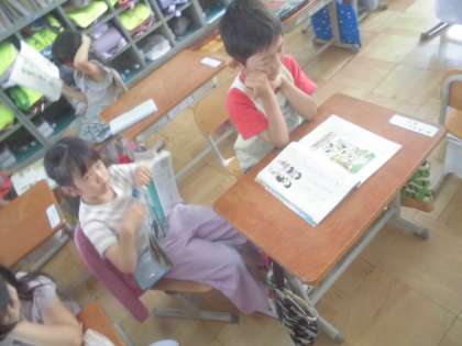 「わたしがはなす。」「みんながわらう。」などの文を作っています。「が」と「。」を意識してノートに書いたり、絵を見て文を考えたりしました。2人組で30個文を作った班もありました。とても意欲的でした。