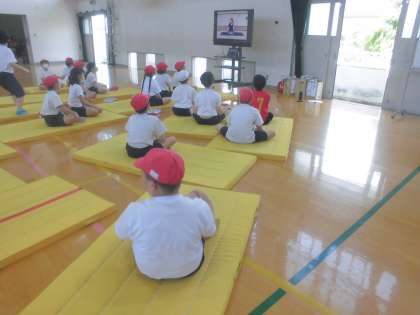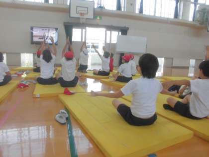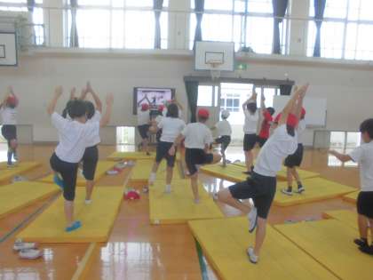 体ほぐしの運動では,ストレッチやヨガをしながら,筋肉をゆっくり伸ばしていきました。