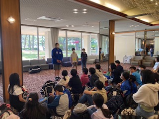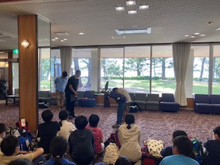 本日の宿、慶野松原荘に到着しました。入館式の様子です。みんな元気に活動しています。
