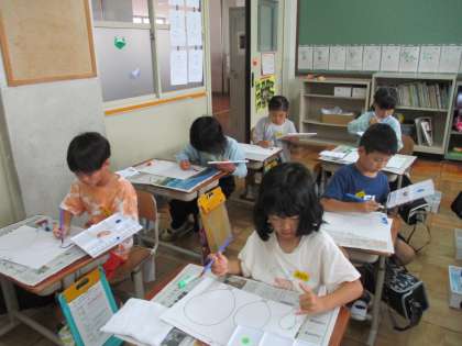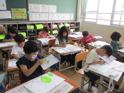 今日は初めて絵の具セットを使って絵の具の学習をしました。