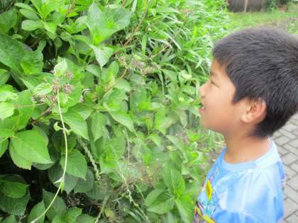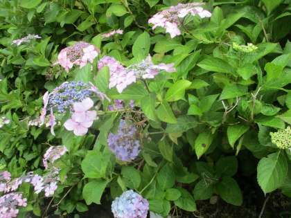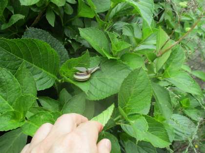 朝、畑の様子を見に行くとき、あじさいの花がとてもきれいに咲いていました。花を見ている時、葉っぱに大きなカタツムリ。「つのだせ やりだせ あたまだせ」と歌を口ずさみながら興味をもって様子を見ていました。