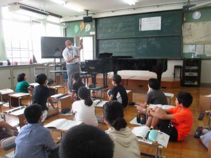 メキシコの音楽 リボンのおどりの学習をしました。メキシコの楽器 マラカス・カウベルが紹介されました。カウベルは大きさや向きによって音が変わるのを感じていました。