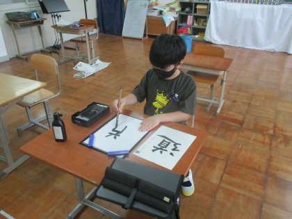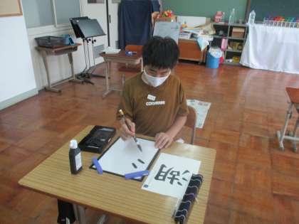 3組の5、6年生では、習字の学習をしました。5年生は「道」6年生は「湖」です。難しい字ですが、手本を見ながら丁寧に書いていました。「心を落ち着けて」を意識することができました。