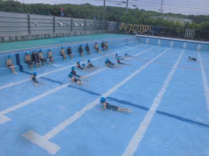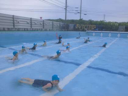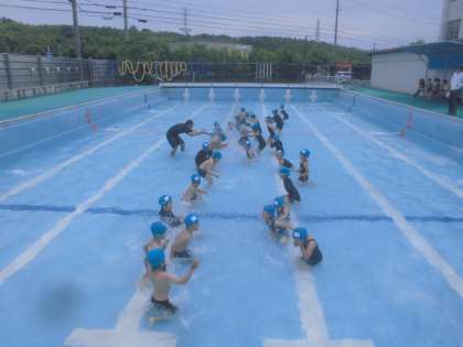 みずあそびで、列車を作ったり、とんねるを作ったりしました。また、カエルになったり、カニになったりして遊びました。ふり返りでは、「初めて顔をつけれてうれしかったです。」や「初めて水中で目を開けることができました。」などありました。