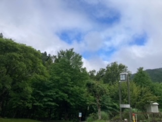 3日目。朝のつどい。係の人が今日の活動内容を伝え、「最後まで頑張りましょう。」と話してくれました。その後、朝の体操をしました。今日の天気は、曇りですが、くもの合間から青空も見えています。