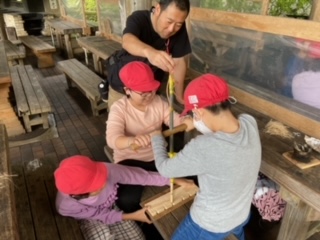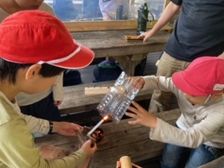 みんなの協力で、火がおこりました。火がおこると歓声があがり、ニコニコ笑顔がいっぱいです。まだの班も協力して、頑張っています。