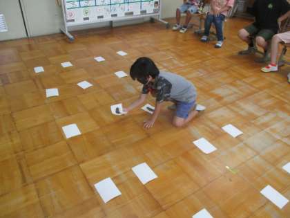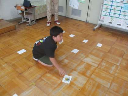 今日の英語では、虫の名前を学習しました。カブトムシやカマキリ、テントウムシなど、英語で何度も発音しながら覚えていきました。最後に、虫の絵カード合わせをして、英語で発表しました。