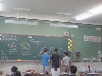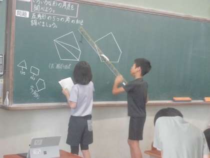 三角形は180度,四角形は360度,五角形は540度・・・と,頂点が増えるごとに180度ずつ増えることに気づいていました。