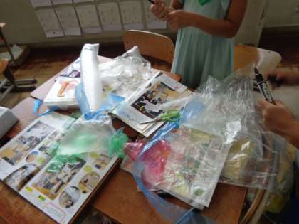 子どもたちは風を使ってビニール袋の動きを試しながら、思いついたことを工夫してビニール袋に表現しました。袋の形を工夫する子、材料のつけ方を工夫する子、とても素敵な作品ができました。