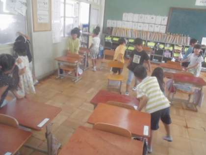 役割分担をして掃除を頑張りました。ここにごみがあると声をかけていました。また、自分の仕事が終わると、まだできていないところを見つけて掃除をする様子も見られました。