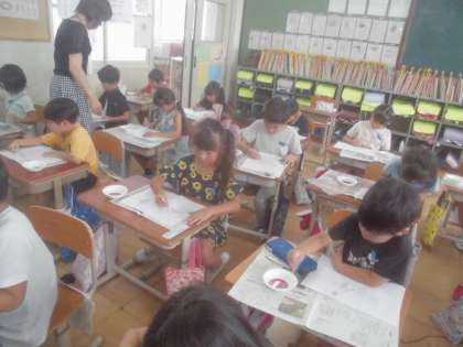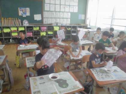 アサガオで色水遊びをしました。半紙を染めたり、好きな絵を描いたりしました。とても嬉しそうに活動をしていました。