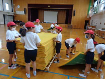 体育の学習でマット運動に取組んでいます。