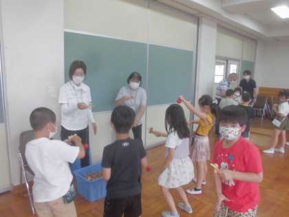 様々な遊びをしました。こま、お手玉、草ずもう、ゴム鉄砲、あやとり、けん玉です。