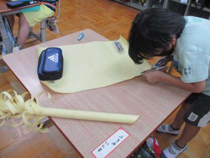 紙を棒状に丸めたり、棒状に伸ばした紙の筒を伸ばしたり、いろいろな作業を通して、飾りを作ることができました。