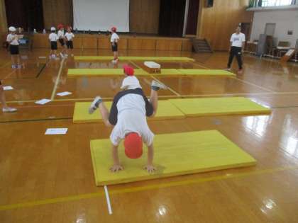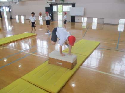 3年生の交流体育では、マット運動を行っています。少し苦手な運動ですが、いろいろとチャレンジして頑張っています。今日は、側転ができるように何度も行っていました。上手になっていくといいですね。
