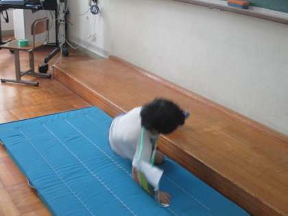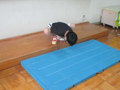 お腹に水を入れたペットボトルを持って、泉に見立てたマットに転がり落ちる演技をしました。