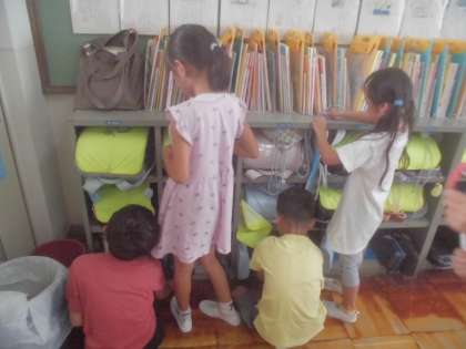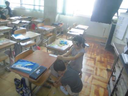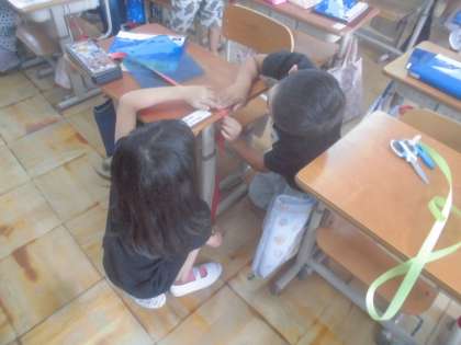 テープを使って、ロッカー、教卓、自分の机の高さ比べをしました。テープを使うと、高さの順番が分かりやすかったです。ペアで協力して活動をしました。