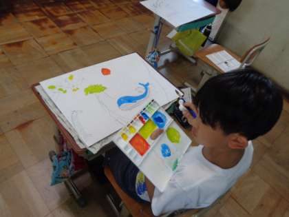 画用紙への下がきも終わり、絵の具で色を塗り進めています。自分のイメージに合うよう色を考えながら丁寧に進めています。