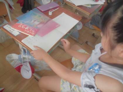 机の横と縦の長さを指や鉛筆を使って比べました。何こ分で何こ多いかなどを調べました。数でわかるとよくわかると感想を述べていました。