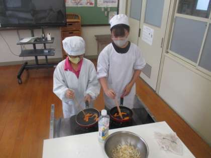 9月13日(水)に家庭科の学習で今年度初めての調理実習がありました。グループごとに野菜炒めを作りました。火の通り方や野菜の切る形や大きさなど色々考えることがありました。この経験を活かせて、お家でも作れるといいですね。