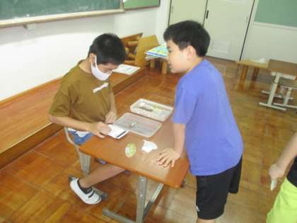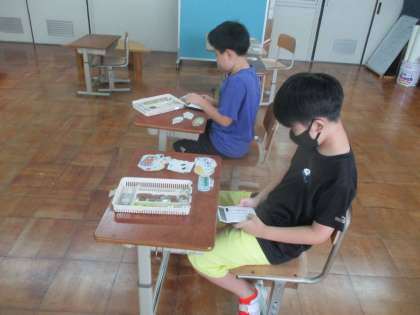 今日は、お店屋さんとお客さんに分かれて、買い物活動をしました。選んだ品物の合計を電卓で計算して、レジ係にもっていきます。レジ係は、お金の合計が合っているかを計算して品物を渡します。ぴったり、少し多い目、おつりなど、いろいろなパターンで取り組んでいました。