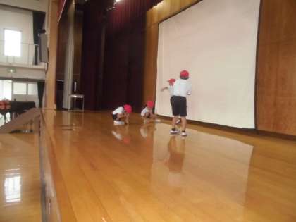 虫になりきっての発表会をしました。様々な虫や様々な動きがありました。子ども達は何の虫になっているのかを見て考えていました。