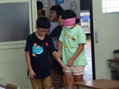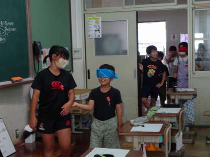 声だけで話している人の場所が分かるかや、指示されたものが取り出せるか、ガイドとともに目的地まで行けるかを体験しました。体験した中から、目が見えなくてもできること、目が見えないから不安なことがあることを感じ取っていました。