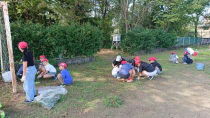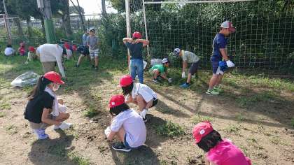 みんな一生懸命に草引きを頑張っていました。あっという間に大きなごみ袋がいっぱいになりました。運動場がとってもすっきりしました。