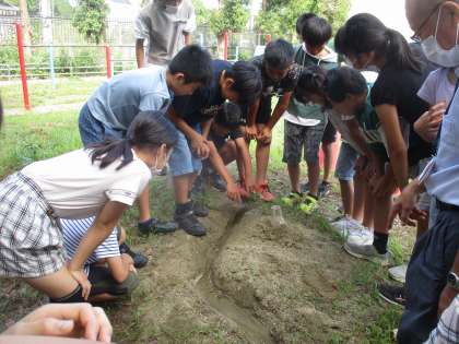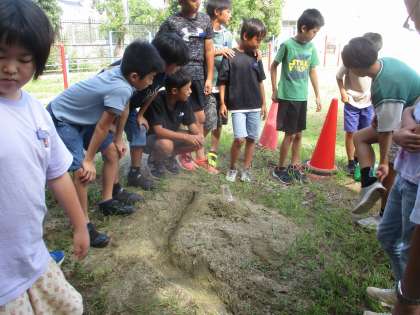 運動場の一角で、流れる水のはたらきの実験をしました。雨が降ったように水を流していくと、川のように流れ、土を運んでいきます。「どんどん広がっていく。」「けずれていっている」など気づいたことを口々に発言していました。